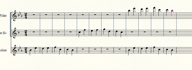 Et le thème B, partagé entre les pupitres de violons, clarinette et flûte.
