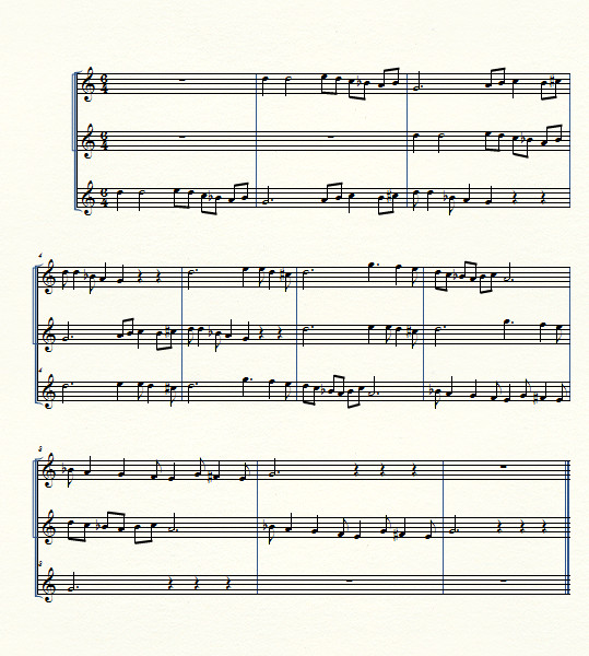 Le premier mot, « écoutez! » est tout d’abord lancé comme un appel, mélangé entre les différentes voix par une entrée en imitations dans la tonalité très claire de fa majeur. (Certaines versions de cette chanson sont en la).